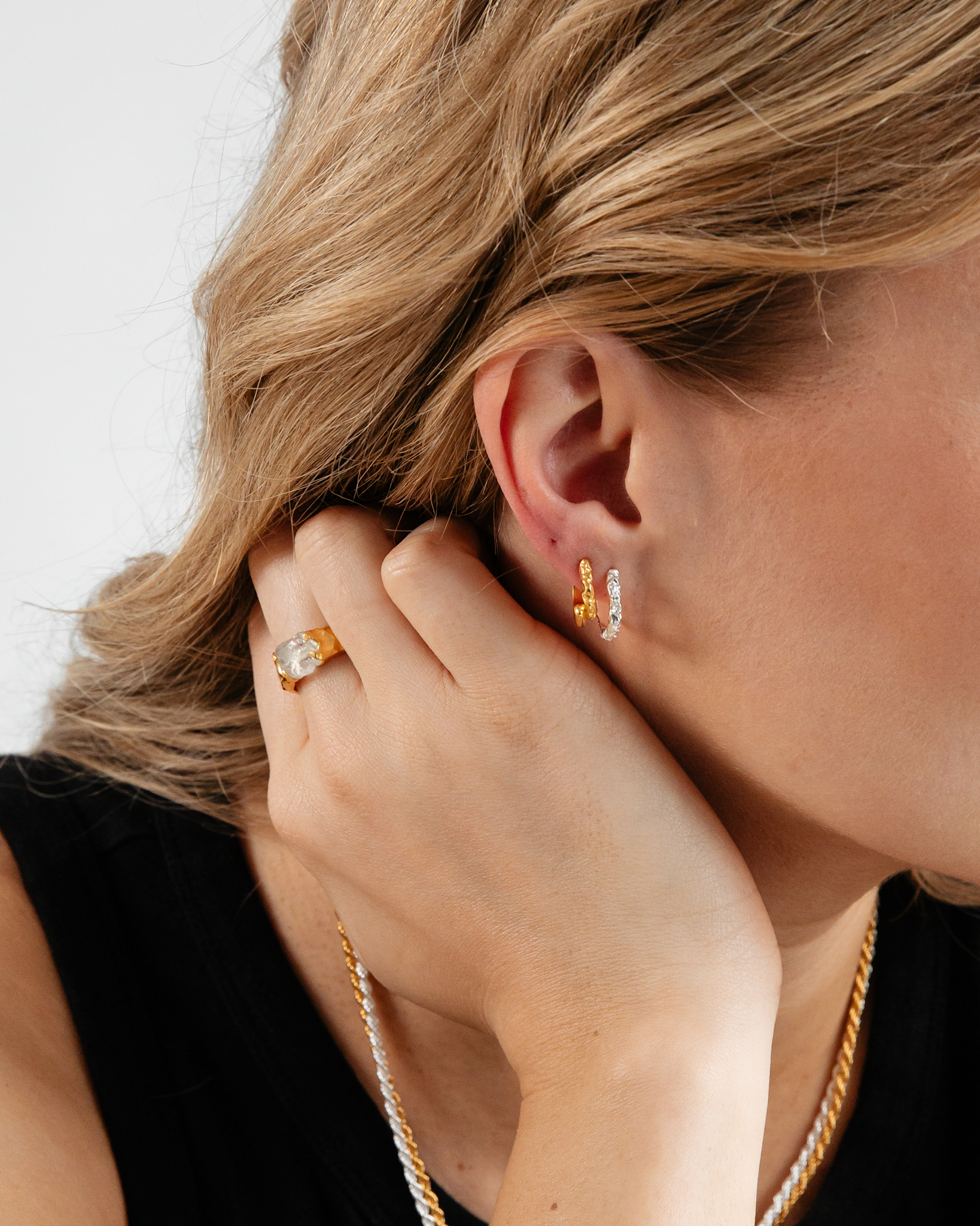 Diese Hoop-Ohrringe sind inspiriert von den Elementen der Natur – Bergen, Steinen und den Strukturen des Sandes. Ihr einzigartiges Design fängt die rohe Schönheit der Natur ein und verleiht Ihrer Schmucksammlung eine organische Note.